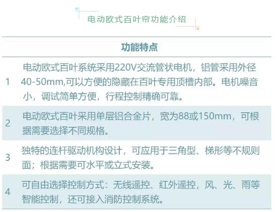 從結(jié)構(gòu)上講歐式百葉的葉片可翻轉(zhuǎn)調(diào)整角度,集百葉簾和天蓬簾的功能于一體,具有調(diào)光、遮陽、保溫、隔熱等多種功能。被廣泛用于玻璃建筑頂面和外墻遮陽隔熱。